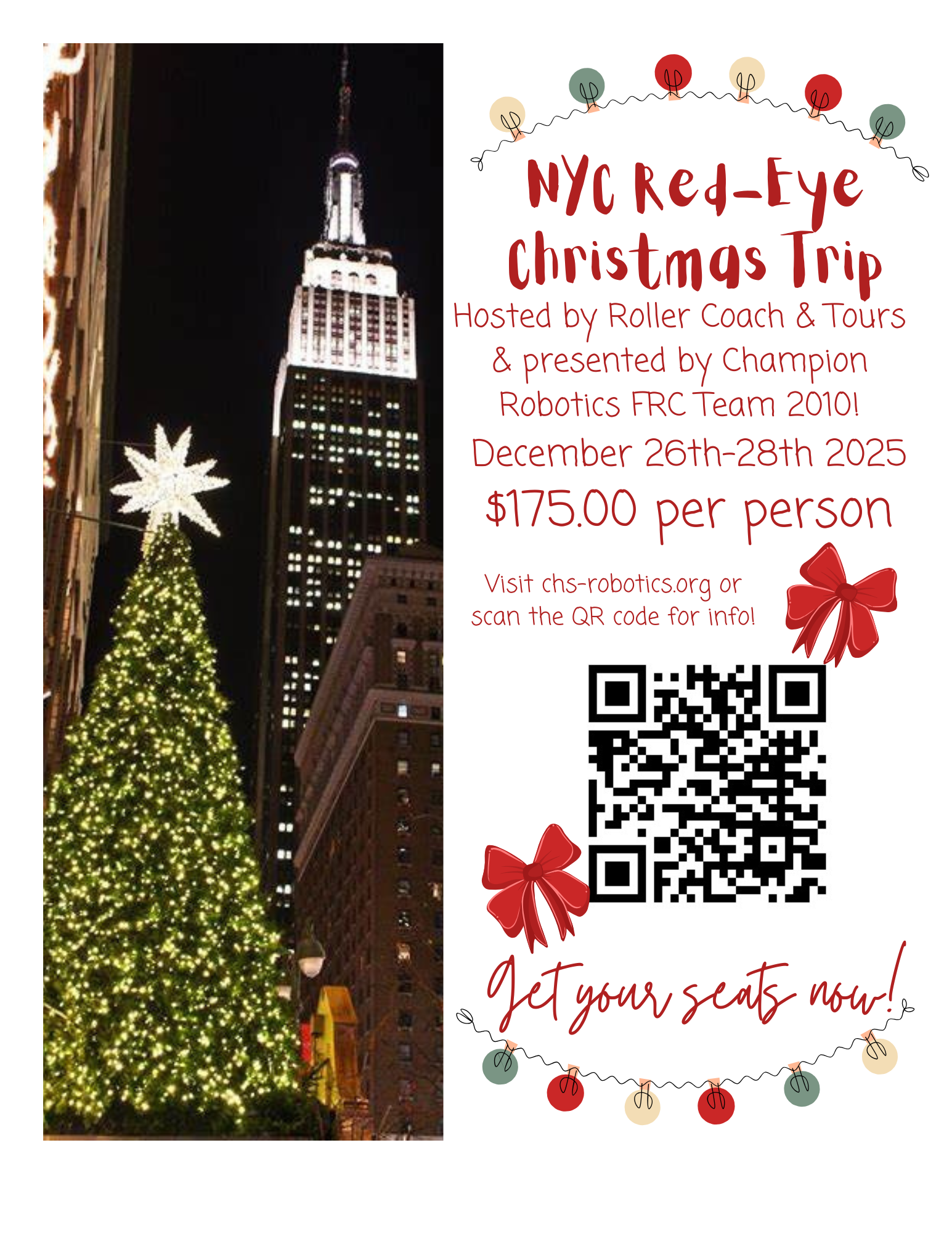 The bus will leave from Champion High School on Friday, December 26th at 11:30pm and drive through the night. The bus will then arrive in New York City at 9:00am where you will have a whole day to explore the city! The bus will then leave at 10:30pm for home, arriving back at Champion High School at 8:00am on Sunday, December 28th. The coach will make stops both ways to freshen up and grab a bite to eat.